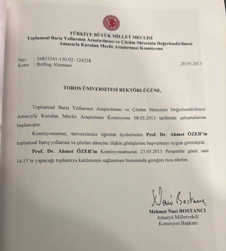 20 Mayıs 2013'te Meclis'te kurulan araştırma komisyonunun başkanlığını yürüten AKP Amasya Milletvekili Mehmet Naci Bostancı, resmi yazıyla Ahmet Özer'i davet etmiştir.