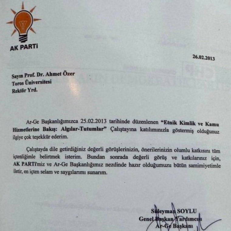 26 Şubat 2013’te AKP Genel Başkan Yardımcısı ve Ar-Ge Başkanı Süleyman Soylu, 'Etnik Kimlik ve Kamu Hizmetlerine Bakış: Algılar-Tutumlar' çalıştayına katıldığı için Ahmet Özer’e teşekkürlerini içeren bu mektubu imzalayıp göndermiştir.