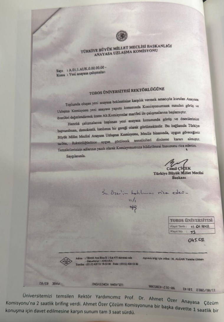 Dönemin TBMM Başkanı Cemil Çiçek, 11 Ocak 2012’de Toros Üniversitesi’nden Anayasa Uzlaşma Komisyonu’na temsilci istemiştir. Bu davet Ahmet Özer’e iletilmiştir.