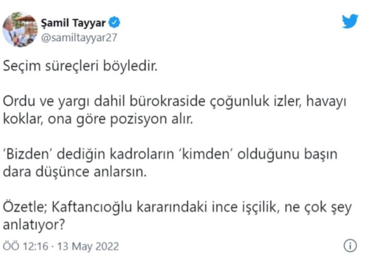 CHP Grup Başkanvekili Özgür Özel sosyal medya hesabından, AKP MKYK Üyesi Tayyar'ın CHP İstanbul İl Başkanı Canan Kaftancıoğlu'yla ilgili sildiği paylaşımını gündeme getirdi. Özel paylaşımında, "Atılıp silinen tweetler çok şey anlatıyor. AKP iktidarı için, yolun sonuna gelindiğini artık herkes biliyor. Psikolojik iktidar el değiştirdi, siyasal iktidarın el değiştirmesi için yoksullar, emekliler, emekçiler, çiftçiler ve gençler artık gün sayıyor" dedi.