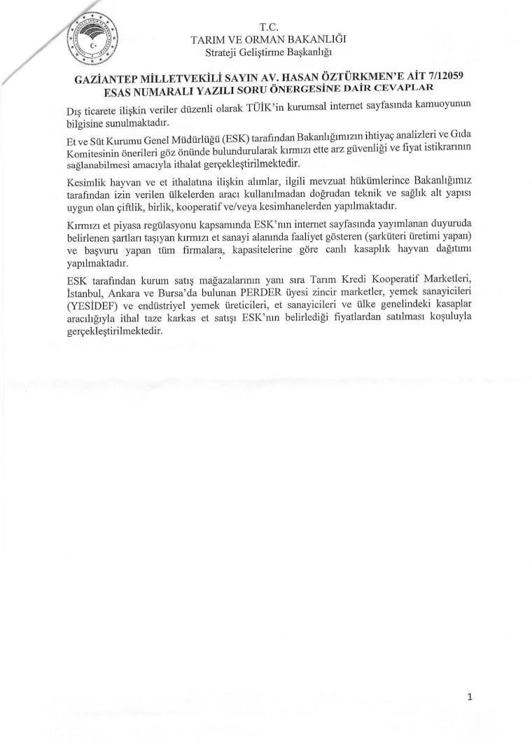 CHP Gaziantep Milletvekili Hasan Öztürkmen'in geçen ay açıkladığı bu büyük ithal et vurgunu gündem olmuştu. Ardından Öztürkmen, büyük vurgunu Meclis gündemine de taşımış, mayıs ayında verdiği soru önergesiyle, ESK'nın bağlı olduğu Tarım ve Orman Bakanlığı'ndan şu soruların yanıtı istemişti:
