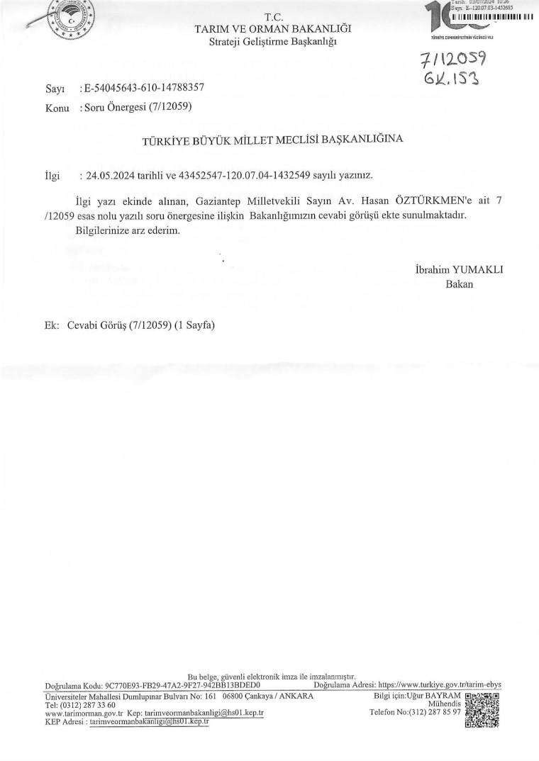 Tarım ve Orman Bakanlığı'ndan Öztürkmen'in soru önergesine yanıt geldi. Ancak Bakanlık, soruların hiçbirine cevap vermedi.