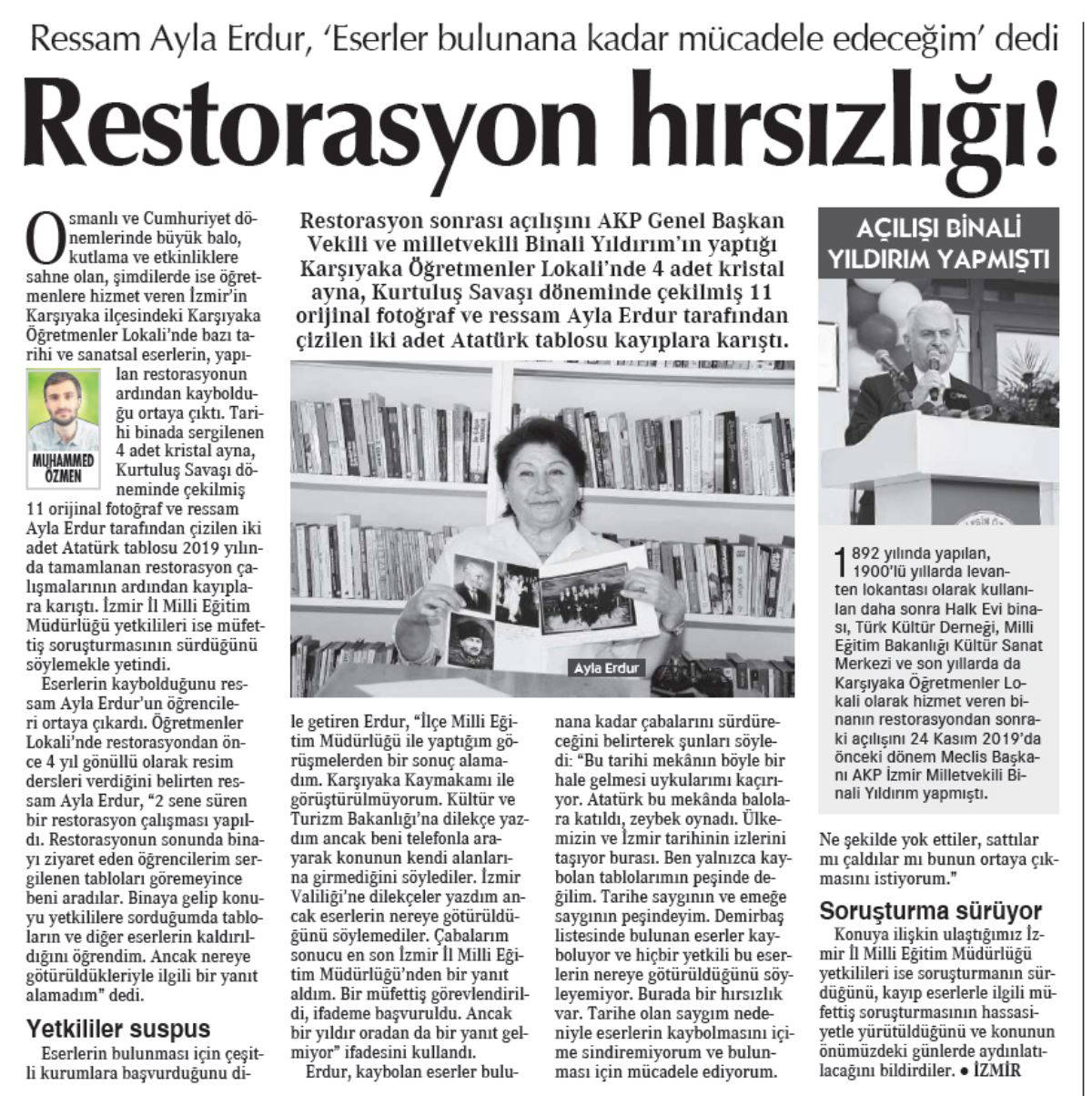 Osmanlı ve Cumhuriyet dönemlerinde büyük balo, kutlama ve etkinliklere sahne olan, şimdilerde ise öğretmenlere hizmet veren İzmir’in Karşıyaka ilçesindeki Karşıyaka Öğretmenler Lokali’nin restorasyonu yapıldıktan sonra 2019 yılında AKP İzmir Milletvekili Binali Yıldırım tarafından hizmete yeniden açıldığını anımsatan Serter, şöyle konuştu: “Restorasyonun ardından Karşıyaka Öğretmenler Lokali’nde 4 adet kristal ayna, Kurtuluş Savaşı döneminde çekilmiş 11 orijinal fotoğraf ve ressam Ayla Erdur tarafından çizilen iki adet Atatürk tablosunun ortadan kaybolduğu ortaya çıktı. Ressam Ayla Erdur'un aylarca süren ısrarları sonrası İzmir Milli Eğitim Müdürlüğü kayıp eserlerle ilgili müfettiş incelemesi başlattı. Hazırlanan raporda 'aynaların söküldüğü sırada kırıldığı, kaybolan 2 Atatürk tablosunun nerede olduğunun tespit edilemediği, eserlerin demirbaş kayıtları olmadığı için herhangi bir işlem yapılmasına gerek olmadığı' ifade edildi. Raporda, Milli Mücadele döneminde çekilen 11 orijinal fotoğrafa ilişkin bir bilgi yer almadı. Hazırlanan bu rapor hırsızlığın üzerinin örtülmesi anlamına geliyor. Bu büyük bir skandaldır. Tarihi değerlerimize yapılan bu saygısızlığın hesabı verilmeli.”