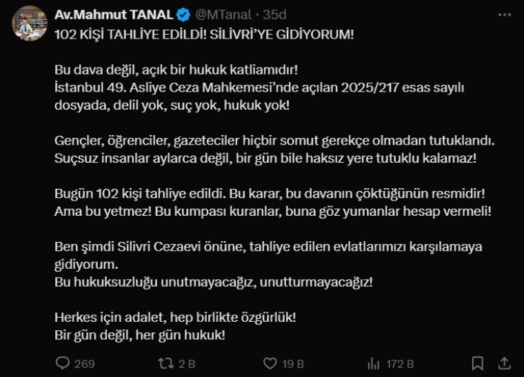 Tahliye edilen gençlerin özgürlüğünü kutlamak için Silivri Cezaevi’ne gideceğini belirten Tanal, "Bugün 102 kişi tahliye edildi. Bu karar, bu davanın çöktüğünün resmidir! Ama bu yetmez! Bu kumpası kuranlar, buna göz yumanlar hesap vermeli!" dedi.