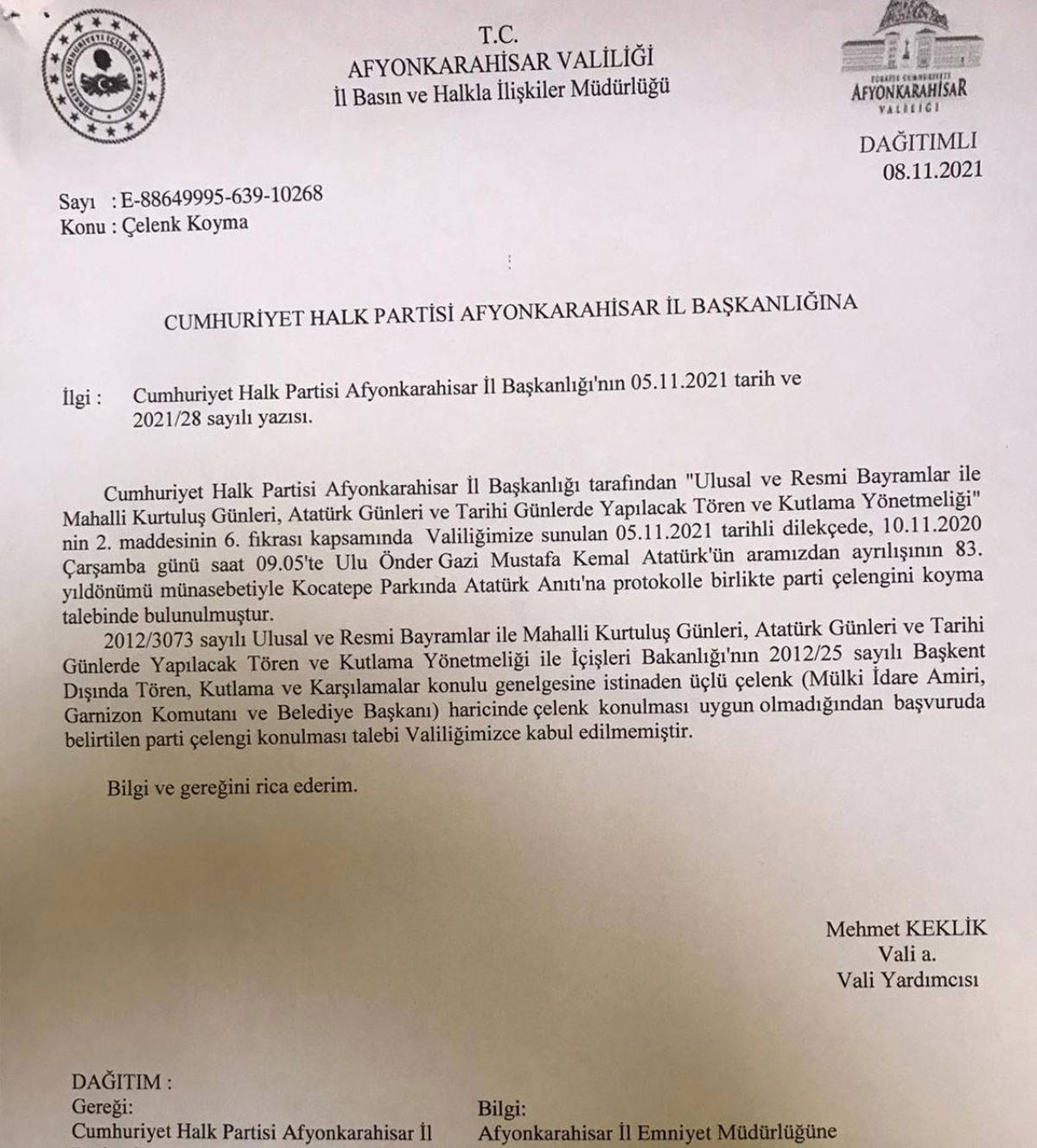 Cumhuriyet Halk Partisi (CHP) Afyonkarahisar İl Başkanlığı tarafından Atatürk'ün ölüm yıl dönümüne ilişkin çelenk bırakma talebi Valilik tarafından reddedildi.