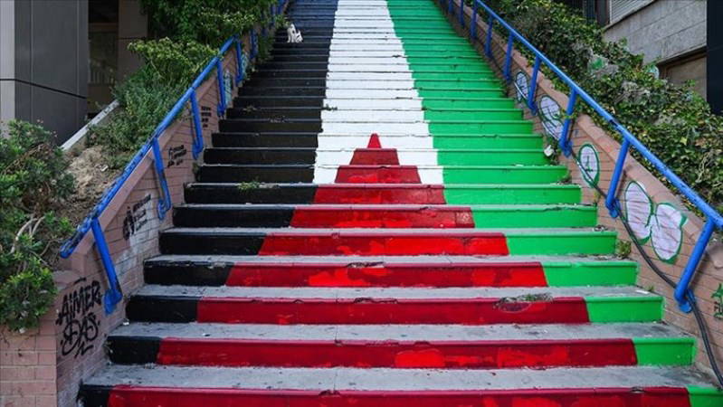 Merdivenler geçen hafta, bir grup tarafından İsrail'in Filistin'e yönelik saldırılarını protesto etmek ve Gazze'ye destek olmak amacıyla Filistin bayrağı resmedilerek boyandı.