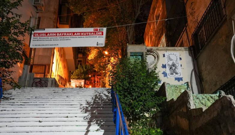 Dün ise CHP'li Beyoğlu Belediyesi harekete geçerek merdivenleri 2013 öncesi haline döndürdü. Merdivenlerin bulunduğu noktaya "Ulusların bayrakları kutsaldır" başlıklı bir pankart asıldı.