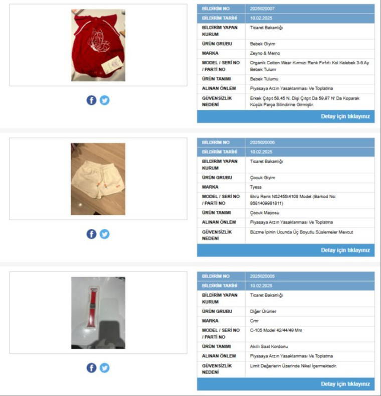 Ticaret Bakanlığı 10 Şubat tarihinde 2'si çocuk giyim ürünü ve 1'i akıllı saat kordonu olmak üzere 3 ürün için piyasadan toplatılmasına karar vermişti. Bakanlık yaptığı denetimler sonucu 1 ürün için daha benzer bir karar aldı.