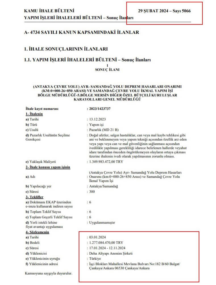 Karayolları Genel Müdürlüğü, 6 Şubat depremlerinin en çok etkilediği Hatay Samandağ’da hasar alan yolların onarımı için 13 Aralık 2023’te ihaleye çıktı. Kamu İhale Bülteni’nde yayımlanan bilgiye göre 6 şirketin teklif verdiği ihaleyi 3 Ocak’ta 1 milyar 277 milyon TL’ye Apaydın’ın ticari temsilcisi olduğu ve sınırlı imza yetkisinin bulunduğu Deha Altyapı Anonim Şirketi aldı.