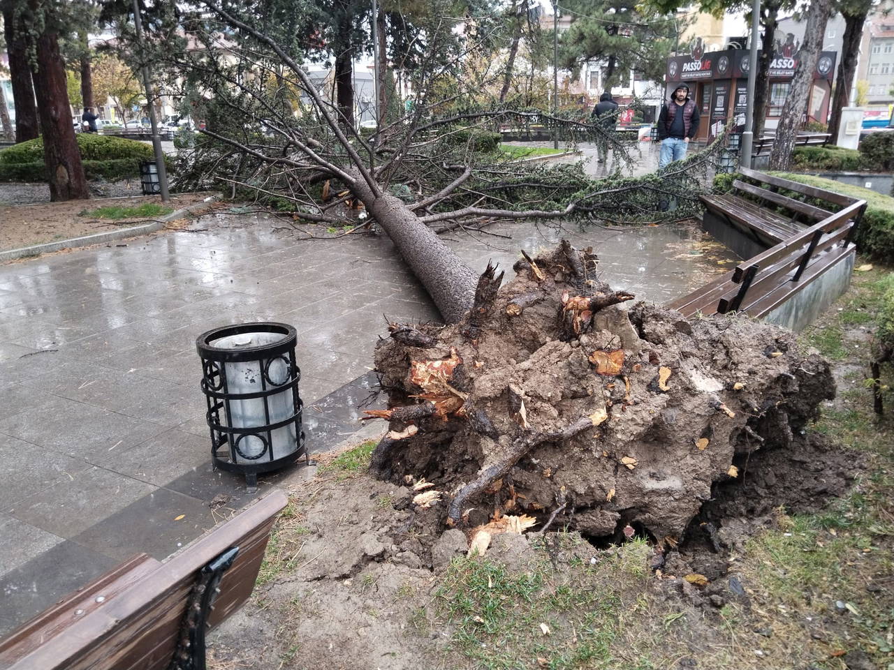 İhbarla bölgeye ekipler sevk edildi. Ekipler binada inceleme yaparken fırtına Hürriyet Meydanı'ndaki bir ağacı kökünden söktü.