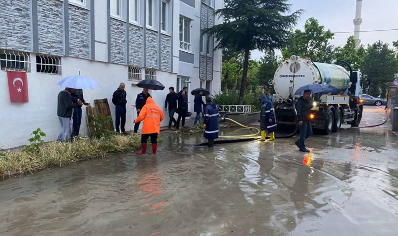 Çorum'da gece saatlerinde başlayan sağanak, sabaha karşı şiddetini artırdı. Sağanak nedeniyle cadde ve sokaklarda su birikintileri oluşurken bazı ev ve işyerlerini de su bastı.