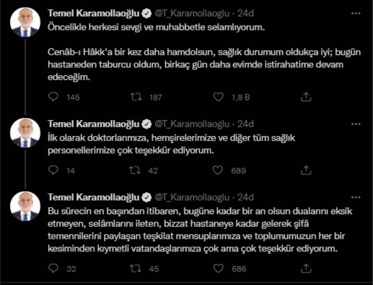 Karamollaoğlu, sosyal medya hesabından yaptığı açıklamada; “Öncelikle herkesi sevgi ve muhabbetle selamlıyorum. Cenâb-ı Hâkk'a bir kez daha hamdolsun, sağlık durumum oldukça iyi; bugün hastaneden taburcu oldum, birkaç gün daha evimde istirahatime devam edeceğim” ifadelerini kullandı.