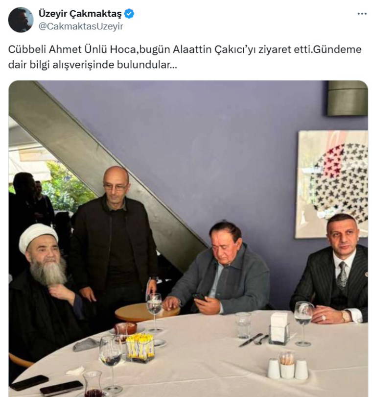 Ziyareti Çakıcı'nın 'yakın dostu' olarak bilinen Üzeyir Çakmaktaş sosyal medya hesabından paylaştı. Çakmaktaş ziyareti, "Cübbeli Ahmet Ünlü Hoca,bugün Alaattin Çakıcı’yı ziyaret etti.Gündeme dair bilgi alışverişinde bulundular…" sözleri ile duyurdu.