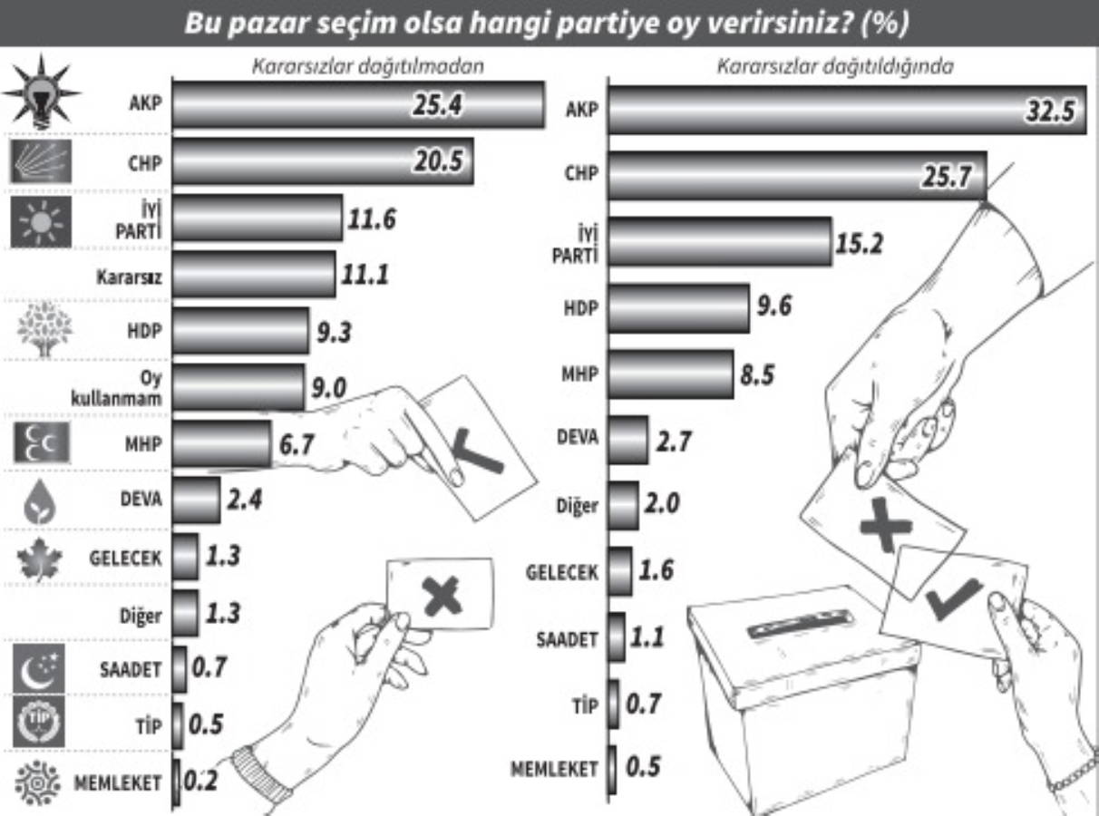 Raporda, siyasetçilerin ocak ayı performansları da değerlendirildi. Buna göre, ocak ayında da en başarılı bulunan siyasetçi Cumhurbaşkanı Tayyip Erdoğan oldu. İYİ Parti Genel Başkanı Meral Akşener ise, ikinci sırada yer aldı. CHP Genel Başkanı Kemal Kılıçdaroğlu ve MHP Genel Başkanı Devlet Bahçeli de aynı puanı alarak üçüncü sırayı paylaştı. “Bu pazar seçim olsa hangi partiye oy verirsiniz?” anketinin sonucunda da, kararsızlar dağıtıldığında AKP’nin yüzde 32, CHP’nin yüzde 25, İYİ Parti’nin yüzde 15, HDP’nin yüzde 9 ve MHP’nin yüzde 8.5 oy aldığı aktarıldı. Böylece Cumhur İttifakı’nın yüzde 50+1 çoğunluğunu sağlayamadığı görüldü. Erdoğan’ın oy oranı, “bu pazar seçim yapılsa yüzde 37,5 - 40 arasında” olduğu aktarılan raporda, “Erdoğan’ın muhtemel rakiplerinin oy oranları ise daha geniş bir aralıkta değişiyor. Erdoğan’a rakip oldukları durumda, en düşük oy oranına Kemal Kılıçdaroğlu, en yüksek oy oranına ise Mansur Yavaş ulaşıyor” değerlendirmesi yapıldı.