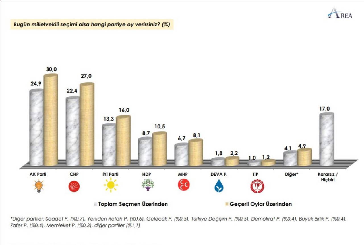 AREA Araştırma nisan ayı “Türkiye Siyasi Gündem Araştırması” sonuçlarını açıkladı. Şirket tarafından paylaşılan son seçim anketi sonuçları 26 ilde 20-25 Nisan tarihleri arasında toplam 2 bin 450 kişi ile bilgisayar destekli telefon görüşmesi ile elde edildi.