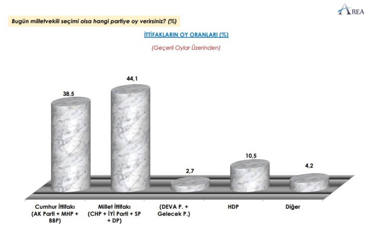 Cumhur İttifakı’nda yer alan AKP, MHP ve BBP’nin geçerli oylar üzerinden oy oranı yüzde 38,5 oldu. CHP, İYİ Parti, Saadet Partisi ve Demokrat Parti'nin Millet İttifakı'nı oluşturduğu senaryoda ise yüzde 44.1 oy oranına ulaşıldı.