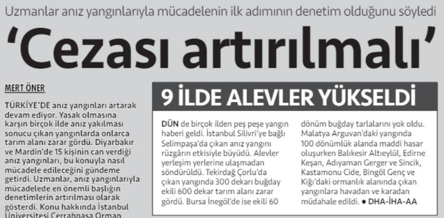 Gazetemizin 29 Haziran tarihli baskısında Mert Öner imzalı yayımlanan haberde 'Anız' yangınlarına dikkat çekilmişti.