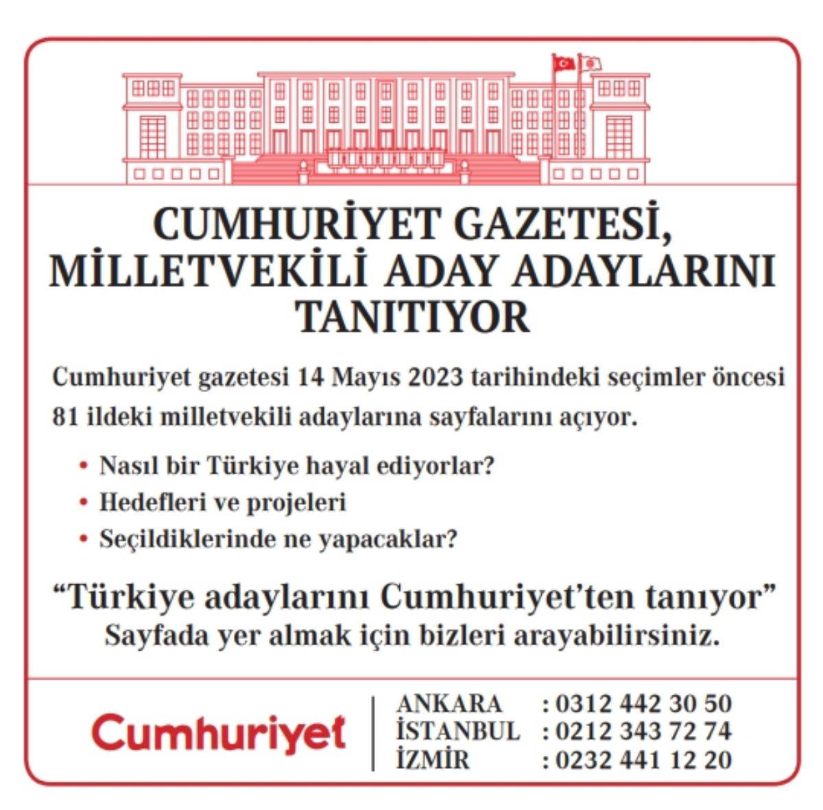 Türkiye'de yurttaşlar, ülke tarihinin en kritik seçimlerinden birine hazırlanıyor. Cumhuriyet gazetesi de yapılacak 14 Mayıs 2023 Cumhurbaşkanlığı ve milletvekili seçimleri öncesi 81 ildeki milletvekili adaylarına sayfalarını açıyor.