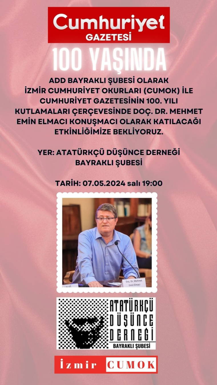 Cumhuriyet Gazetesi’nin 100. yılı yurt genelinde çeşitli etkinliklerle kutlanıyor. İzmir’de de Atatürkçü Düşünce Derneği (AAD) Bayraklı Şubesi ile İzmir Cumhuriyet Okurları (CUMOK) Doç. Dr. Mehmet Emin Elmacı’nın katılımıyla bir panel düzenleyecek.