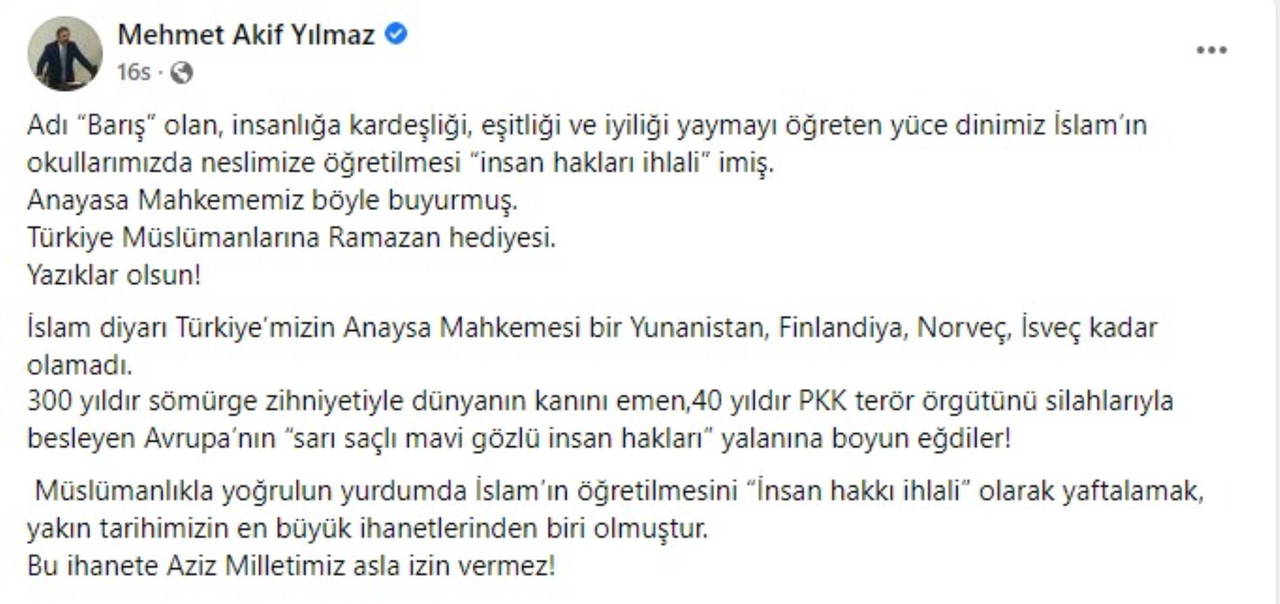 Sosyal medya hesabı üzerinden paylaşım yapan Yılmaz, "Müslümanlıkla yoğrulun yurdumda İslam’ın öğretilmesini “İnsan hakkı ihlali” olarak yaftalamak, yakın tarihimizin en büyük ihanetlerinden biri olmuştur" ifadelerine yer verdi.