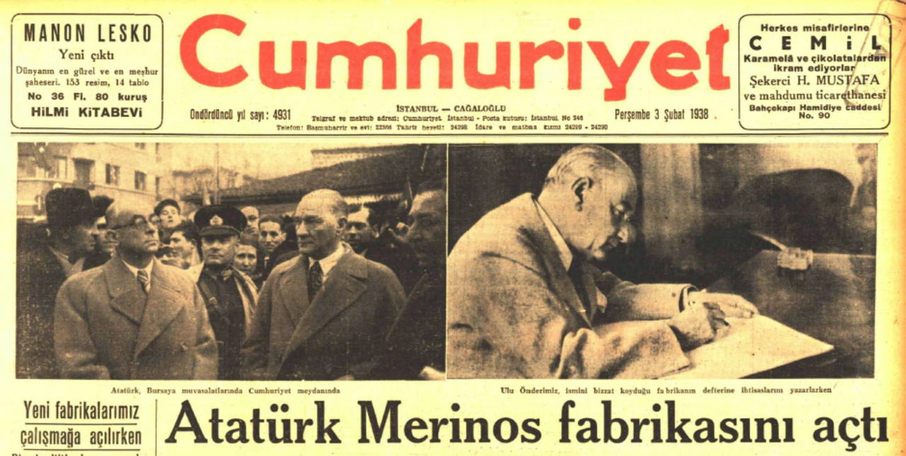 Saat tam 16 da Ulu Önder, refakatlerinde Başvekil, Dahiliye, Nafıa ve İktisad vekillerile diğer zevat olduğu halde halkın candan tezahüratı arasında Merinos fabrikasını şereflendirmişlerdir.