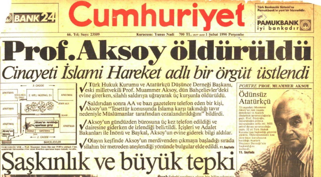 Türk Hukuk Kurumu ve Atatürkçü Düşünce Derneği Başkanı, eski milletvekili Prof. Muammer Aksoy, dün Bahçelievler’deki evine girerken silahlı saldırıya uğrayarak üç kurşunla öldürüldü. Saldırıdan sonra AA ve bazı gazetelere telefon eden bir kişi Aksoy’un “Tesettür konusunda İslama karşı takındığı tavır nedeniyle Müslümanlar tarafından cezalandırıldığını” bildirdi. Aksoy’un gündüzden bürosuna üç kez telefon edildiği ve dairesine giderken de izlendiği belirtildi. İçişleri ve Adalet bakanları ile İnönü ve Baykal, Aksoy’un evine giderek bilgi aldılar. Olayın keşfinde Aksoy’un merdivenden çıkmaya başladığı sırada silahın bir metreden ateşlendiği yönünde bulgular elde edildi.