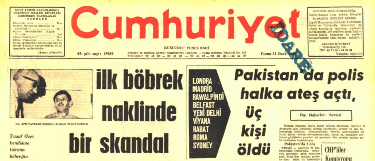Türk tıp tarihinin en büyük skandalı, yurdumuzda ilk defa olarak organ nakli yapılan Yusuf Özer tarafından meydana çıkarıldı. Yedi ay önce Beyoğlu Belediye Hastanesinde böbrek takılan Yusuf Özer, kendisine verilen organın Recep Ilgaz’dan alınmayıp İsmail Akar adında aklî muvazenesi tam olmayan bir şahıstan temin edildiğini ihbar etmiştir.