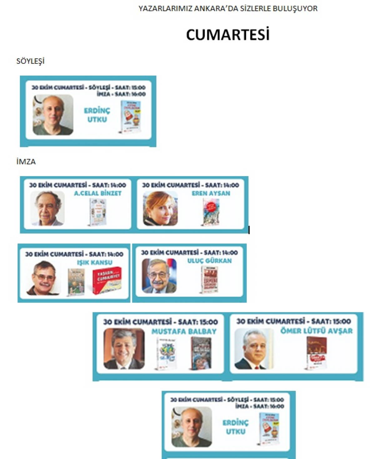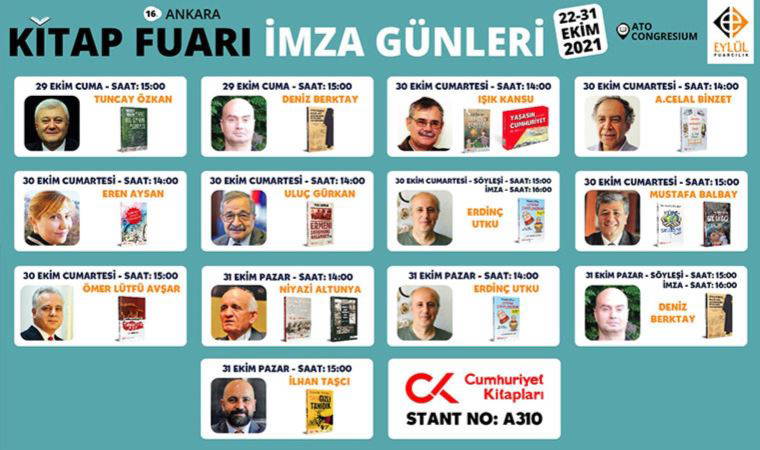 Cumhuriyet Kitapları yazarları Işık Kansu, Mustafa Balbay, Mine G. Kırıkkanat, Uluç Gürkan, Hikmet Özdemir, Hüner Tuncer, Tuncay Özkan, Meltem Vural, Alper Akçam, Eren Aysan, Ömer Lütfü Avşar, Niyazi Altunya, Erdinç Utku, A. Celal Binzet, Deniz Berktay ve İlhan Taşçı; A310 numaralı Cumhuriyet Kitapları standında kitaplarını imzalayacak. Okuyucular sevdikleri yazarların kitaplarını fuara özel indirimlerle edinebilecekler.