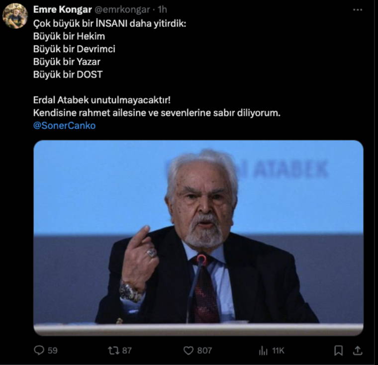 Alev Coşkun: Erdal Atabek, Cumhuriyet değerlerine ve Atatürk ilkelerine sahip çıkan çok değerli bir yazarımızdı. Sevenlerinin acısını paylaşıyoruz.