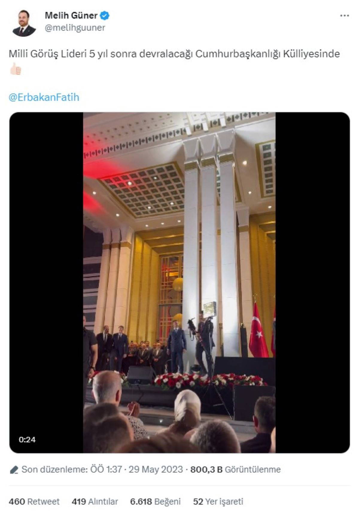 Yeniden Refah Partisi Genel Başkanı Fatih Erbakan’ın Saray’da sahneye davet edildiği anları paylaşan YRP Gençlik Kolları Başkanı Melih Güner “Milli Görüş Lideri 5 yıl sonra devralacağı Cumhurbaşkanlığı Külliyesinde” ifadelerini kullandı.