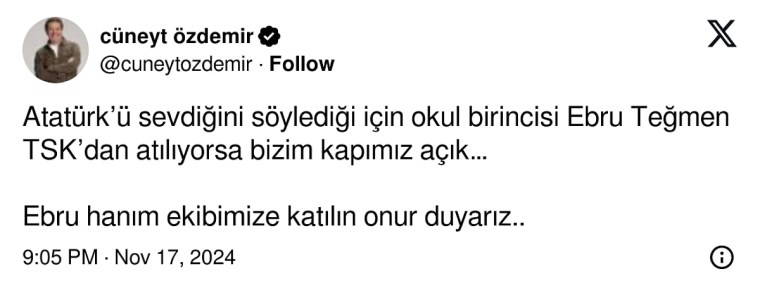 Özdemir, Teğmen Ebru'ya ekiplerine katılması için davette bulunurken konuyla ilgili bir de eleştiride bulundu.