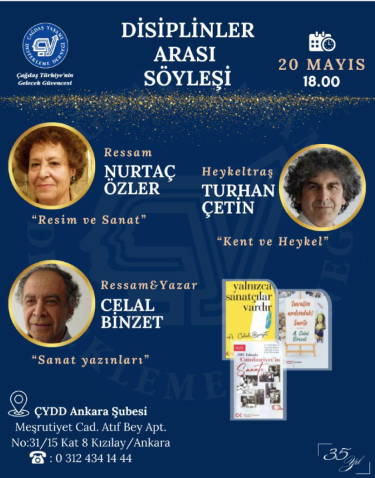 Çağdaş Yaşamı Destekleme Derneği (ÇYDD), yarın saat 18.00’de “Disiplinler Arası Söyleşi” etkinliği gerçekleştirecek. Ankara’nın Çankaya ilçesinde bulunan ÇYDD Ankara Şubesi’nde yapılacak söyleşide, ressam Nurtaç Özler, heykeltıraş Turhan Çetin ile ressam ve yazarımız A. Celal Binzet yer alacak.