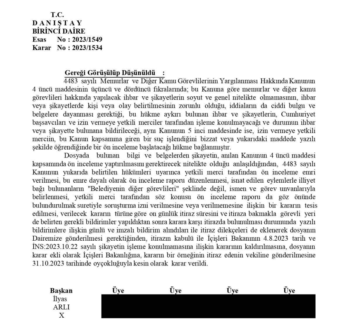 Avukat Kerim Bütün’ün itirazı üzerine Danıştay Birinci Dairesi, İçişleri Bakanı Yerlikaya’nın söz konusu kararını kaldırdı. AKP’li belediye hakkında ön inceleme yaptırılması gerektiği belirtilen kararda, şu ifadelere yer verildi: