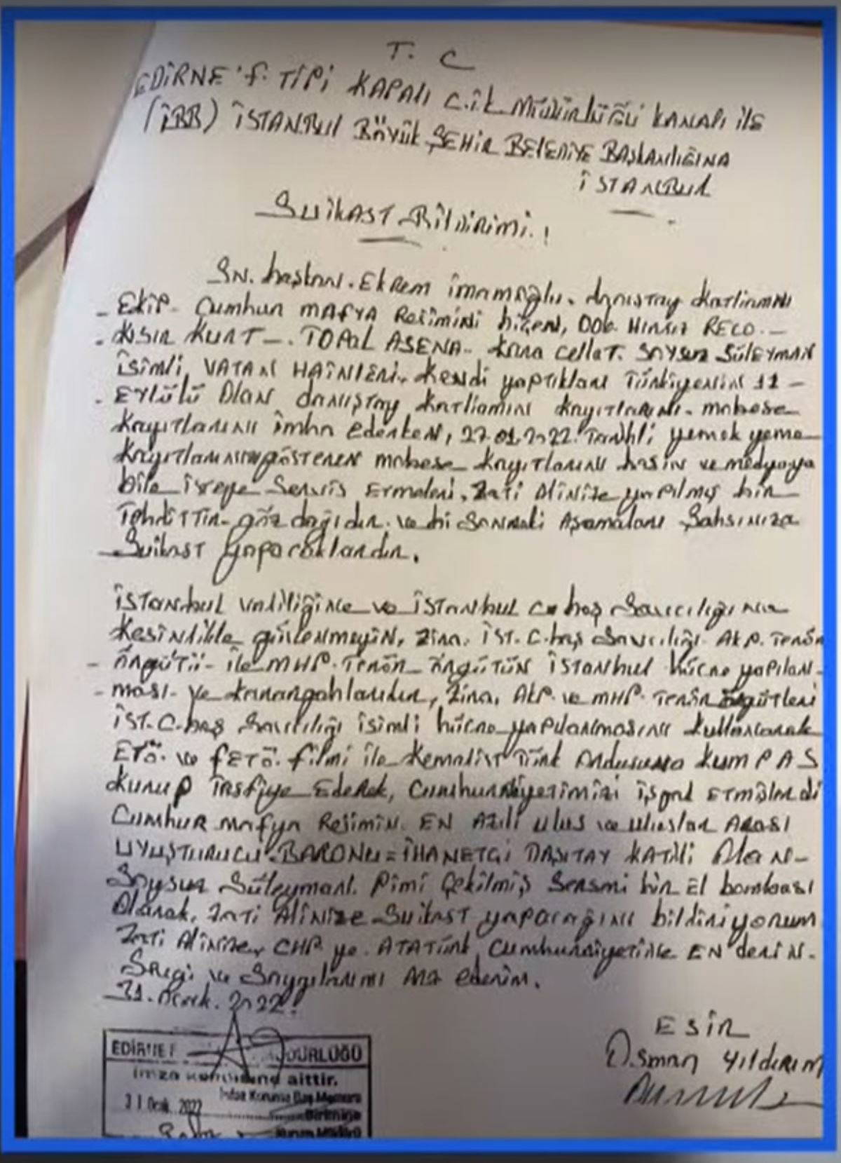 - Osman Yıldırım, 31 Ocak 2022 günü cezaevine idaresine bir dilekçe yazıyor. Dilekçe, suikast bildirimi başlığını taşıyor. Altında da kendi imzası var. Verdiği dilekçede, Ekrem İmamoğlu'na bir suikast yapılacak. Bunu da İBB'ye verin diyor.