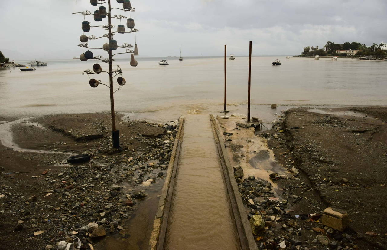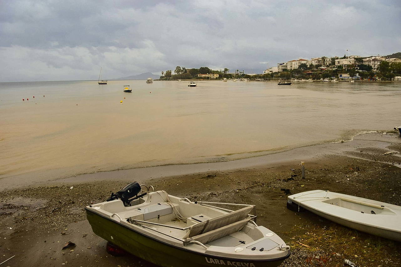 Elektrik kesintisinin de yaşandığı ilçede yağan yağmur sonrası Kumluk Plajı'nda denizin rengi, derelerin taşıdığı çamurlu yağmur suları nedeniyle kahverengiye döndü.