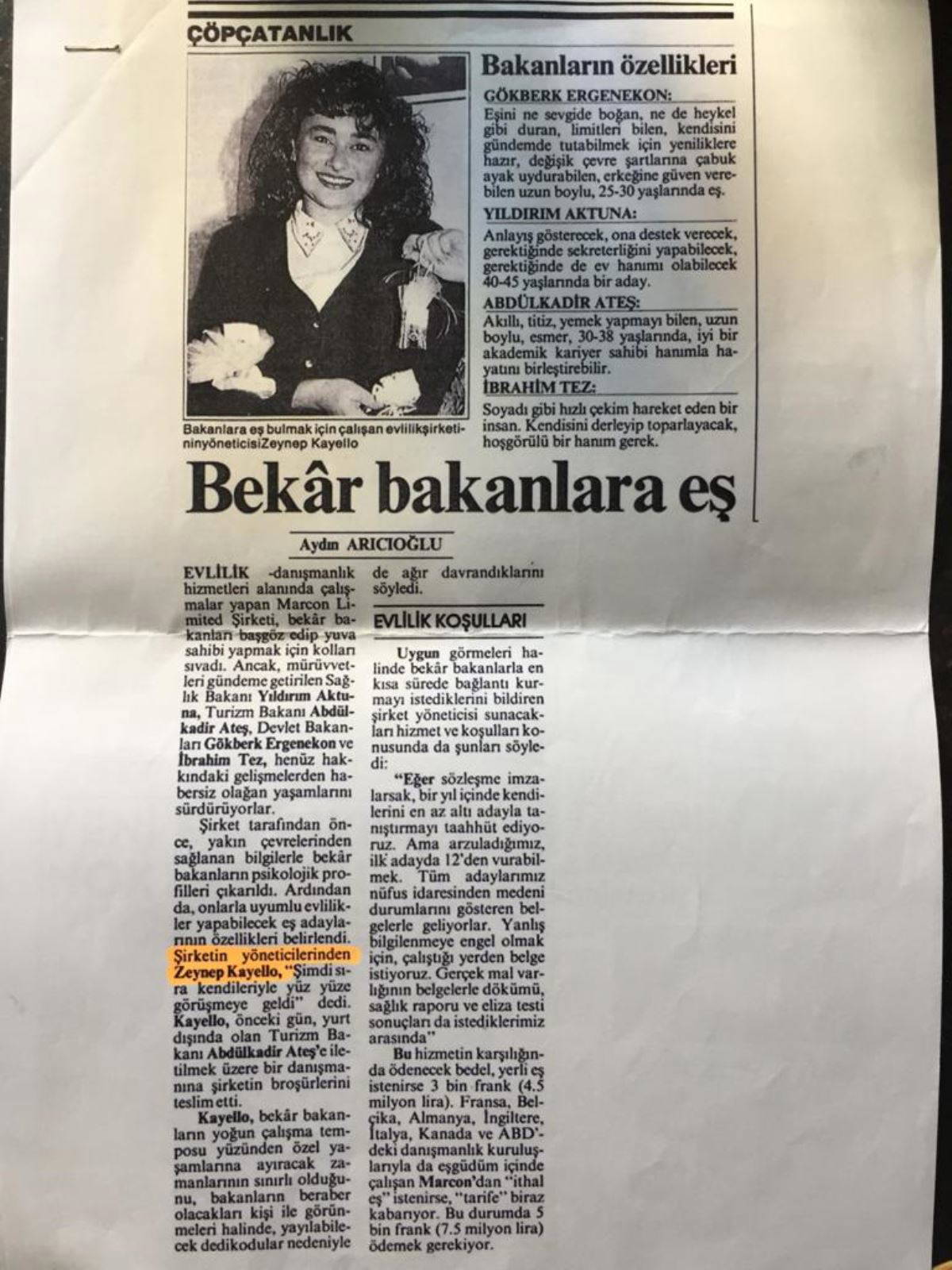 Zeynep Kayello’nun bilimsel eş bulma yöntemi çok başarılı olmalı ki dönemin bekâr bakanları Gökberk Ergenekon, Yıldırım Aktuna, Abdülkadir Ateş ve İbrahim Tez’i de başgöz etmek için harekete geçiyor. Bunu da bir yıl sonraki bir gazete haberinden öğreniyoruz. Zeynep Kayello, ilk olarak dönemin Turizm Bakanı Abdülkadir Ateş’i gözüne kestirmiş ve çöpçatanlık şirketinin broşürlerini bakanın danışmanına teslim etmiş. Kayello o dönemde bizim gazete de dahil pek çok gazetede haber olmuş. Hatta televizyona bile çıkmış. Hem de Rüstem Batum Show programına. ABD’de iç mimarlık eğitimi almış olduğunu belirten Zeynep Kayello’nun, asıl mesleği olan iç mimarlık şirketi kurmak yerine çöpçatanlık şirketi kurması da enteresan. Tabii gerçekten böyle bir eğitim aldıysa...