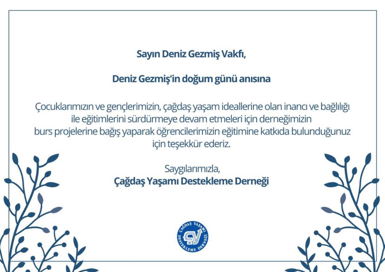 Türkiye'de devrimci sol hareketin en önemli isimleri arasında yer alan Deniz Gezmiş 76. doğum gününde anılıyor. Deniz Gezmiş Vakfı, Deniz Gezmiş’in doğum günü anısına Çağdaş Yaşamı Destekleme Derneği (ÇYDD) aracılığıyla 10 çocuğa burs sağlamak için katkıda bulundu. ÇYDD'den yapılan açıklamada, "Çocuklarımızın ve gençlerimizin, çağdaş yaşam ideallerine olan inancı ve bağlılığı ile eğitimlerini sürdürmeye devam etmeleri için derneğimizin burs projelerine bağış yaparak öğrencilerimizin eğitimine katkıda bulunduğunuz için teşekkür ederiz" açıklamasıyla Deniz Gezmiş Vakfı'na teşekkür edildi.