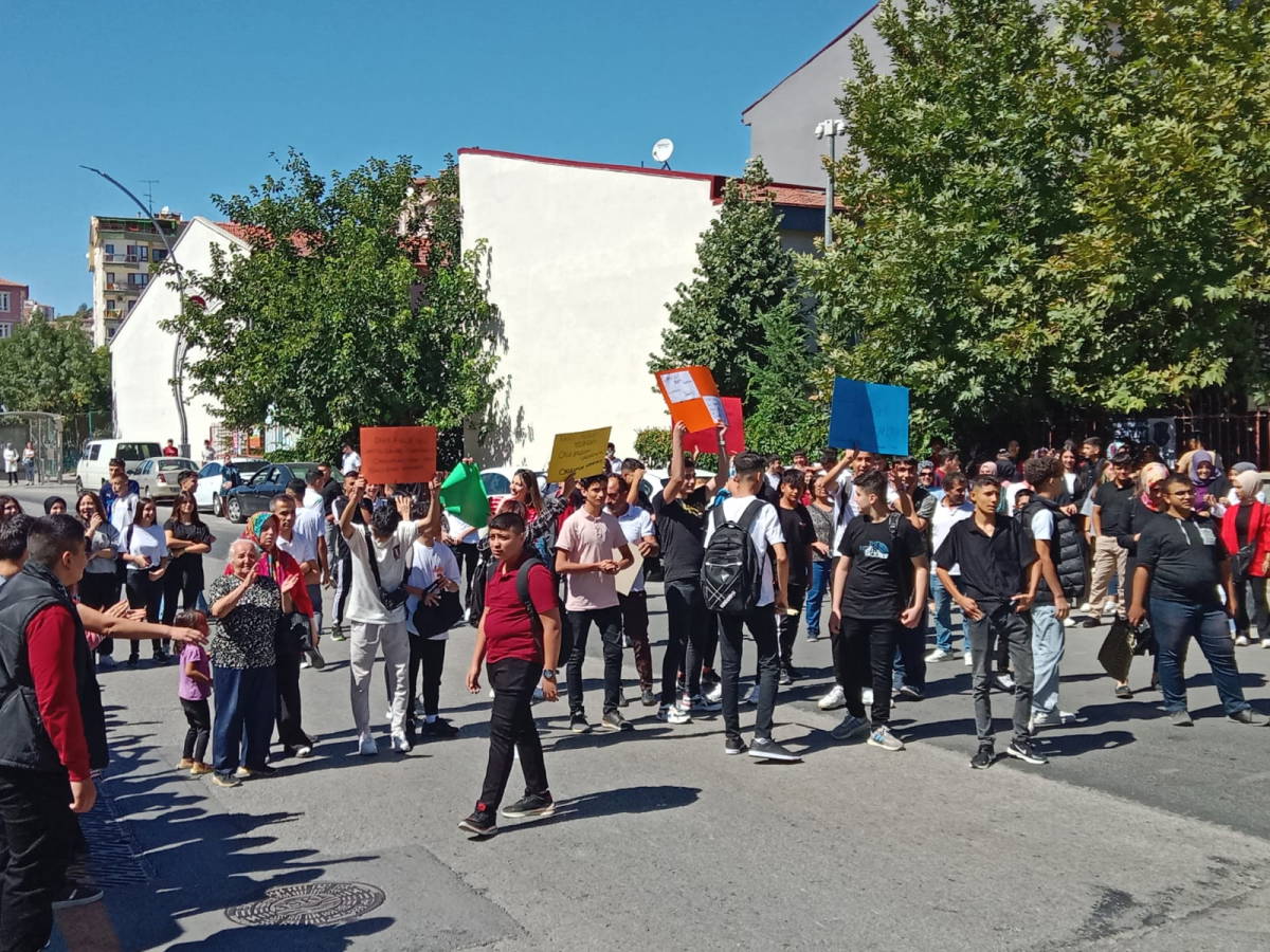 Öğrenciler ellerinde “Gece vardiyası istemiyoruz”, “Rant meselesi yüzünden okulumuzdan vazgeçmeyiz” ve “Eğitim hakkımızı isteriz” dövizleriyle okullarını geri istedi.