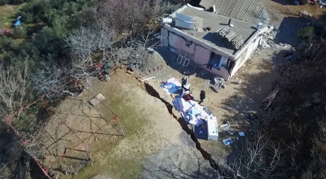Kahramanmaraş depremlerinin köylere verdiği hasar, havadan görüntülerle ortaya çıktı. Gaziantep Nurdağı'nda Gökçedere köyünde evlerin ve yolların yanısıra mezarlıkta da yarıklar oluştuğu görüldü.