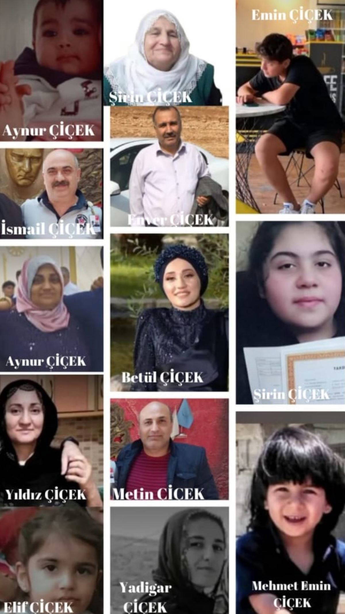 Enkaz çalışmalarının 6’ncı gününde ise Çiçek ailesinden Aynur (bebek), Şirin, Emin, Enver, İsmail, Aynur, Betül, Yıldız, Metin, Mehmet Emin, Elif ve Yadigar Çiçek’in cansız bedenleri çıkartıldı.