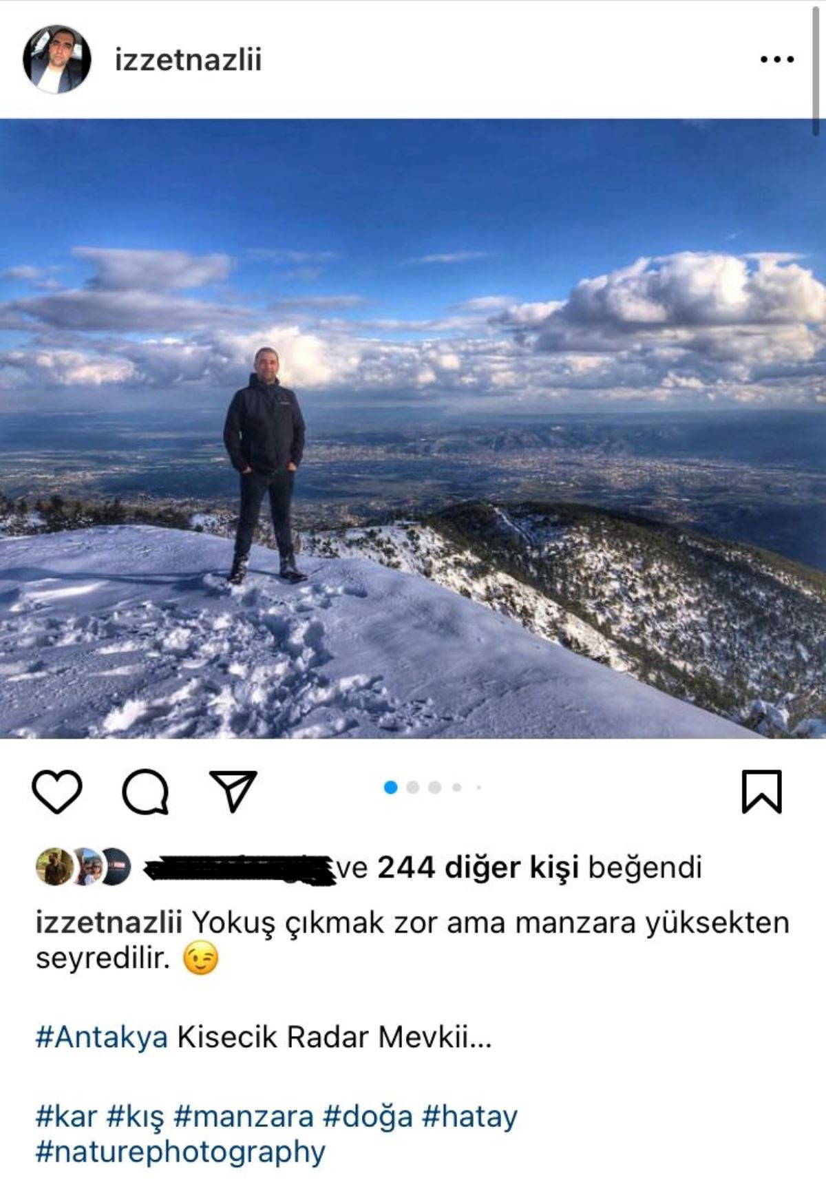 İzzet Nazlı, 2 Şubat'ta Amanos Dağları'na çıkıp, karda çektirdiği fotoğraflarını sosyal medya hesabından "Yokuş çıkmak zor ama manzara yüksekten seyredilir" şeklinde not düşerek paylaşmıştı.