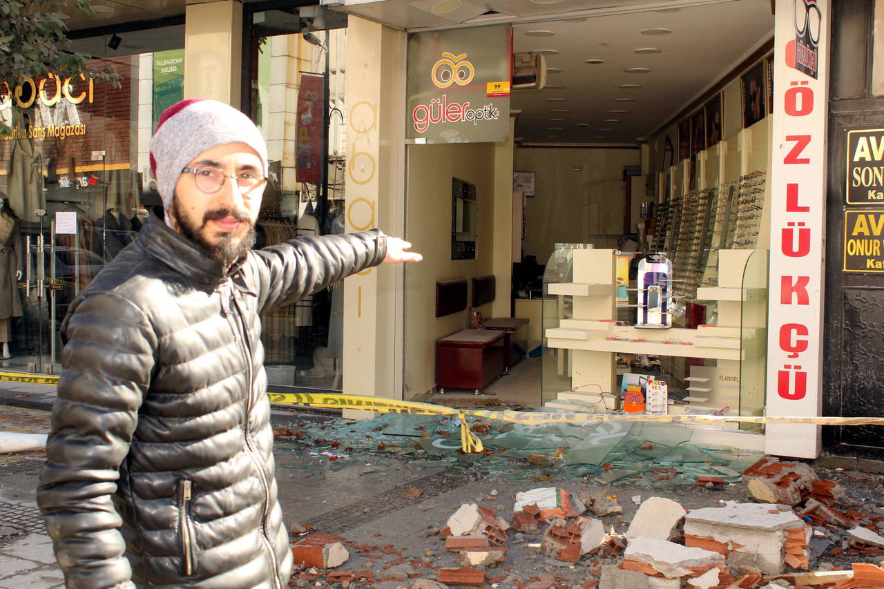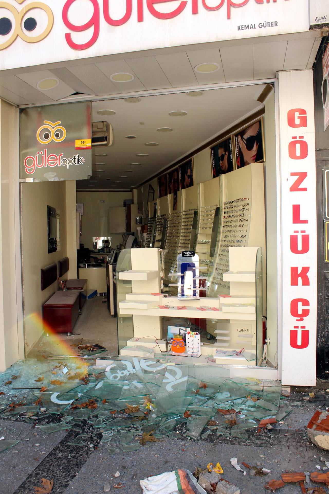 Malatya'da kentin en işlek noktalarından İnönü Caddesi'nde hasar gören bir binanın altındaki gözlükçü dükkanının cam kapısı ve camları depremde kırıldı, gözlükler ise sergilendikleri raflarda kaldı.