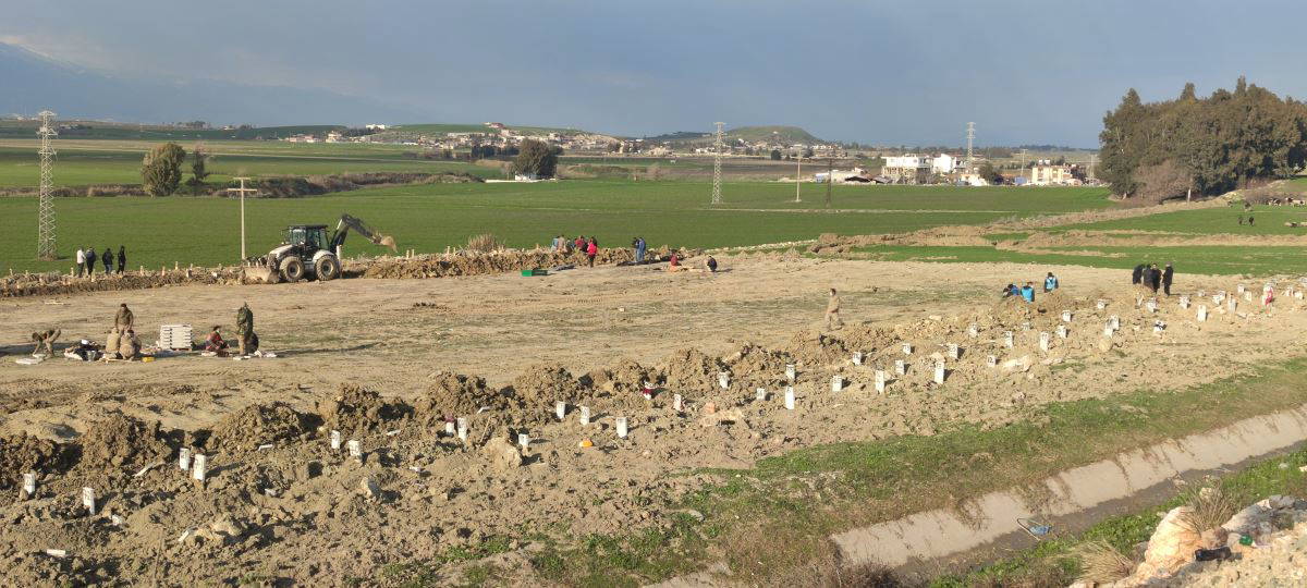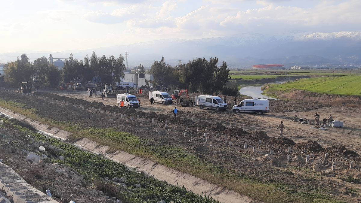 Hatay'ın Antakya ilçesine bağlı Narlıca Mahallesi’nde oluşturulan mezarlık alanına getirilen cenazeler, kimlik belirleme ve otopsi işlemlerinin ardından kamu görevlileri tarafından yan yana son yolculuğuna uğurlanıyor.