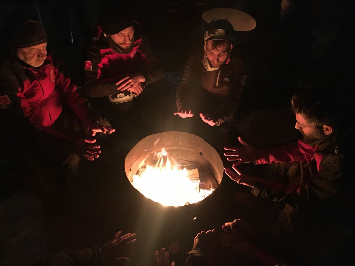 İnsanların içini ısıtacak haber vermek için yoğun bir şekilde çalışan ekipler, dinlenmeye çekildiklerinde sıranın yeniden kendilerine gelmesini beklerken alanda yaktıkları ateşin kenarında ısınmaya çalışıyor.