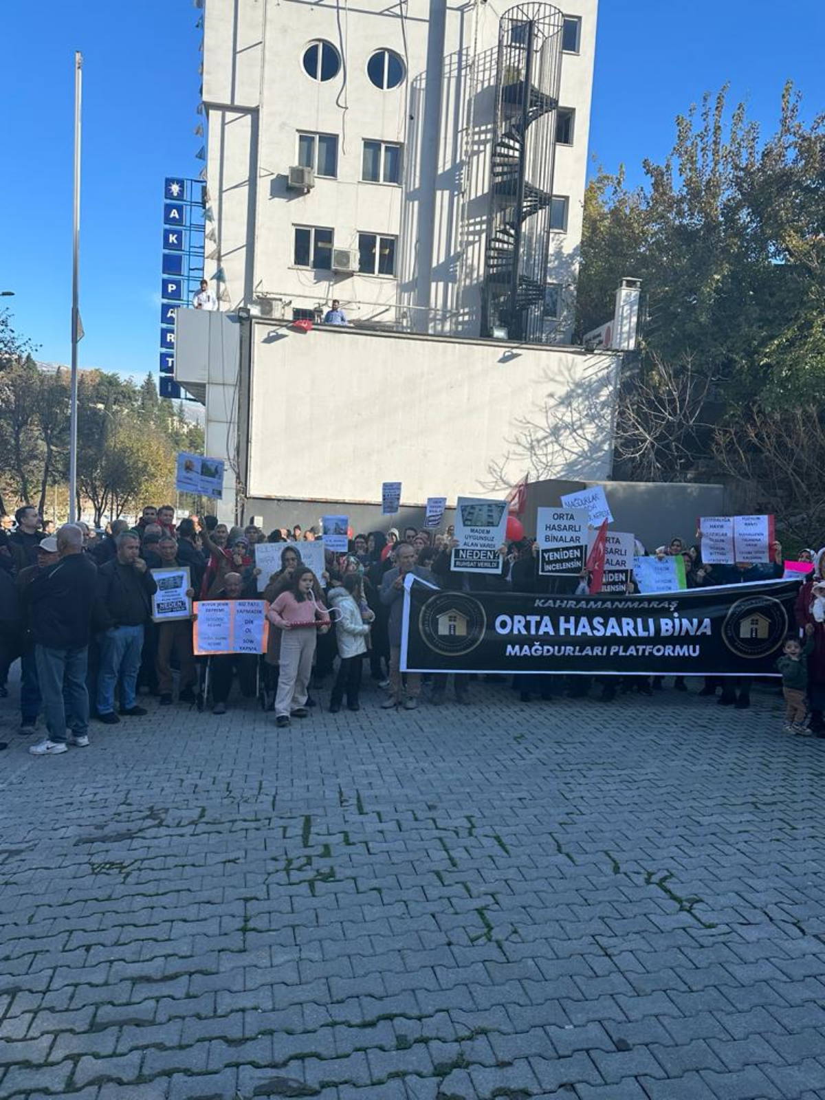 Kahramanmaraş AKP İl Başkanlığı önünde dün toplanan Uygun Olmayan Alan ve Orta Hasarlı Bina Mağdurları Platformu destekçisi yurttaşlar, basın açıklaması yayınlayarak yetkililere çağrıda bulundu.