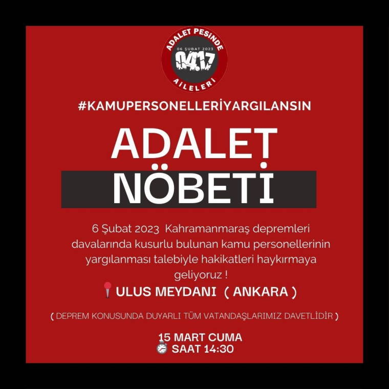 Depremin üzerinden yaklaşık 15 ay geçti. Buna karşın neredeyse hiçbir davada kamu personelleri yargılamalara davet edilmedi, tanık olarak bile dinlenmedi. Bu duruma dikkat çekmek isteyen Adalet Peşinde Platformu üyeleri, “Kamu Personelleri Yargılansın” başlığıyla Adalet Bakanlığı önünde eylem yapmak için resmi başvuruda bulundu. Ankara Valiliği, ailelerin Adalet Bakanlığı önünde yapmak istedikleri eylem talebine 10 gün sonra olumsuz yanıt verdi. Bunun üzerine depremzedeler eylemi 15 Mart Cuma günü saat 14.30’da Ankara Ulus Meydanı’nda yapma kararı verdi. Karar sonrası Cumhuriyet’e konuşan kayıp yakını Avukat Seda Mutaf, depremlerde binlerce insanın yaşamını yitirmesi ve maddi zarara uğramasına karşın, devletin ilgili kurumlarının, müteahhitlerin, yapı denetim firmalarının, proje müelliflerinin ve uygulayıcılarının yeterli dersli çıkarmadığını söyledi.
