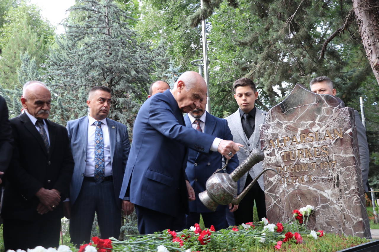 MHP Genel Başkanı Devlet Bahçeli, bayram namazının ardından MHP'nin kurucu Genel Başkanı Alparslan Türkeş'in Beştepe'deki mezarını ziyaret etti. Burada kendisini karşılayan partililerle bayramlaşan Bahçeli, Türkeş'in kabrine karanfil bıraktı.