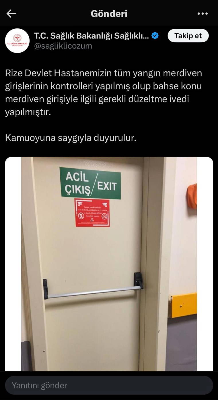 Açıklamada, “Rize Devlet Hastanemizin tüm yangın merdiven girişlerinin kontrolleri yapılmış olup bahse konu merdiven girişiyle ilgili gerekli düzeltme ivedi yapılmıştır. Kamuoyuna saygıyla duyurulur” ifadelerine yer verdi.