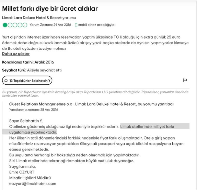 Antalya Limak Lara Hotel’in, İngiltere'deki bir site üzerinden rezervasyon yaptıran müşterinin Türk olduğu fark edince 120 Euro "milliyet farkı ücreti" aldığı ortaya çıkmıştı.