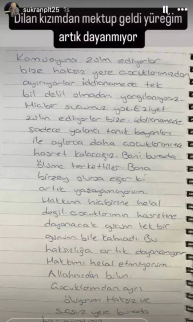 Engin Polat'ın annesi Şükran Polat, Dilan Polat'ın kendisine gönderdiği mektubu sosyal medya hesabından paylaştı.
